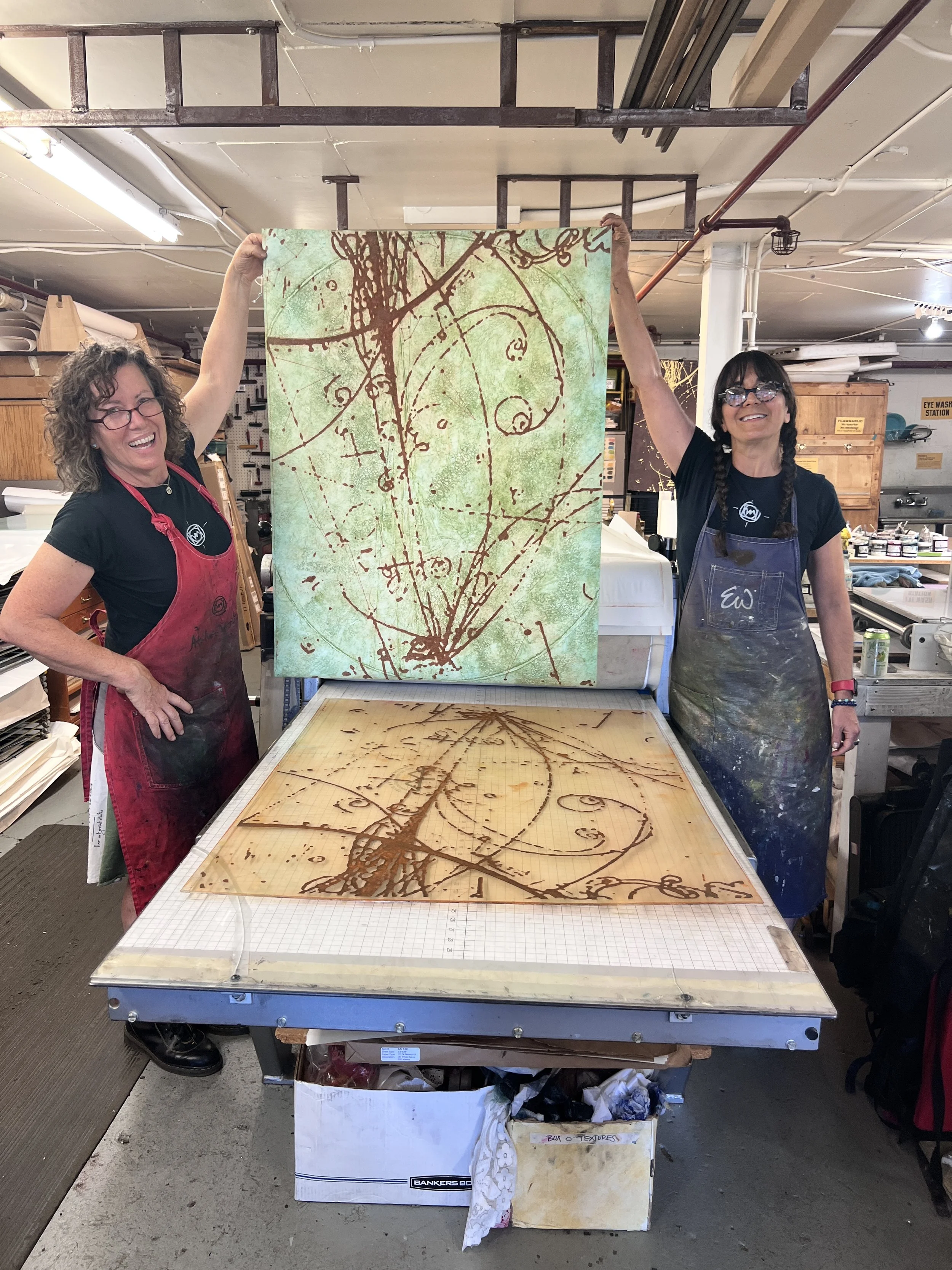 My 3-day Portland Residency began with a bundle of nerves, as I was not quite sure that what I envisioned would come out as expected…but upon arrival to River Street Studios, Jane and I fell right back into our old rhythm established 15 years ago of of teaching and collaborating together; Wags & Pags, the ink pushers from Jersey were back! We were ON, inking and printing like mad for three ten hour days ‘til our elbows ached. I feel so lucky to have such a special collaborative relationship grounded in mutual respect with Jane, she is the best, always encouraging different approaches, always optimistic and up for a new challenge. We are very alike!