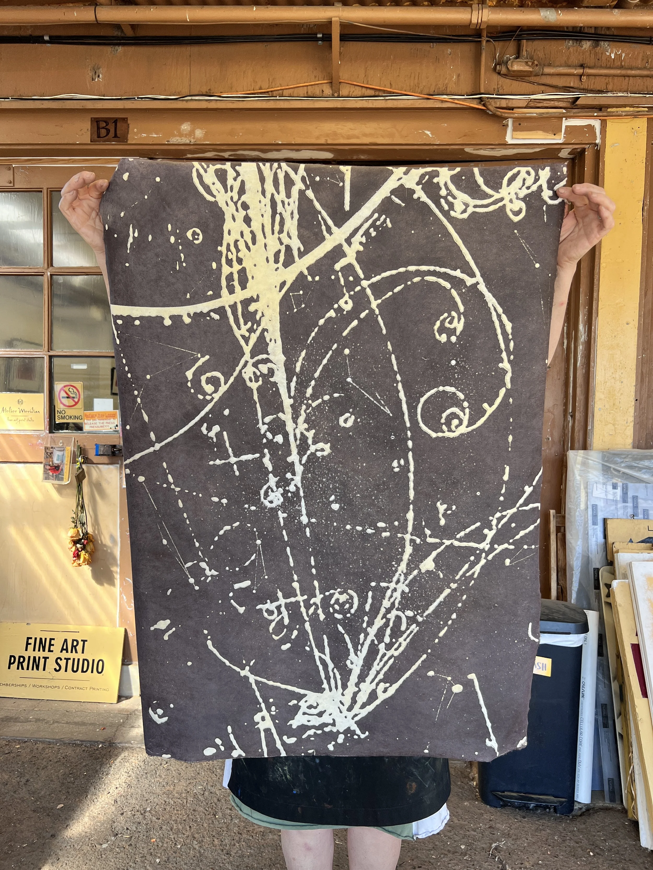 Last month, thanks to grants from the Oregon Arts Commission and Ford Family Foundation, I stepped outside my home studio and partnered up once again with a old friend, Jane Pagliarulo at Atelier Meridian. I had always wanted to do large prints of a specific image from particle physics. With the help of a massive laser etching machine at Forge Graphic Works, my idea came to fruition. I created 9 30” x 40” prints using my Encaustic Collagraph Wax, Akua Intaglio Inks, and Freudenberg’s Evolon, which I found through Leslie Guliani at Encaustiflex.com.